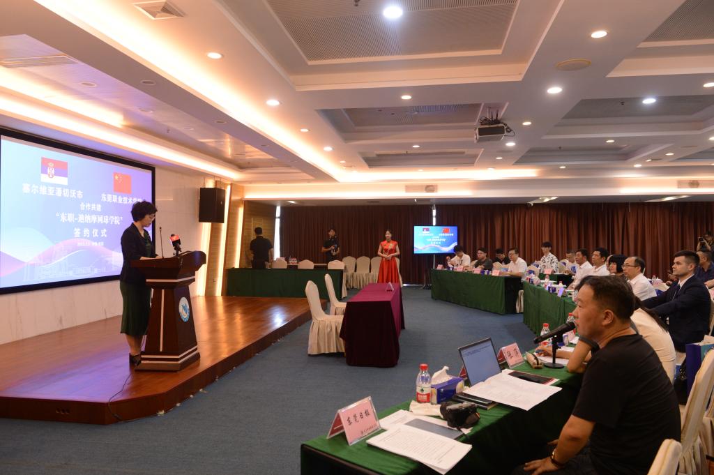 7月5日下午,我校与塞尔维亚潘切沃市合作共建“东职-迪纳摩网球学院”签约仪式在我校图书馆展示交流中心报告厅举行。东莞市政协副主席程发良,东莞市外事局局长谢玉华,中国大学生体育协会职业教育学校体育工作委员会秘书长贾书申,我校党委书记朱益民,校党委副书记、校长贺定修,党委副书记、纪委书记蔡东宝,党委委员、副校长杨云奇,副校长刘海光,塞尔维亚迪纳摩网球学院代表马克·亚戈迪奇(Marko Jagodic)等嘉宾出席本次签约仪式。